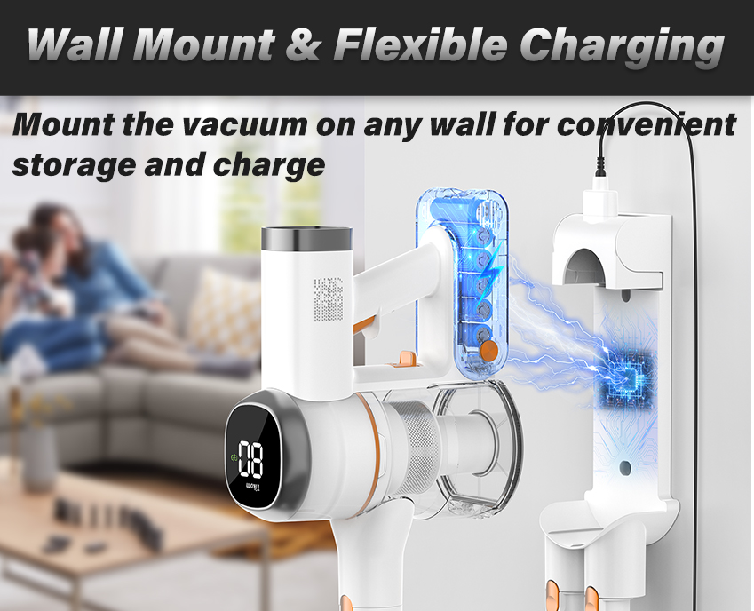 【Wall-Mounted Charging Dock】 Equipped with a 6*2000 mAh removable battery and a wall charge station, the rechargeable vacuum offers 2 charging methods. Detach the battery to charge separately, or keep the vacuum cleaner on the wall dock for automatic charge and storage.
