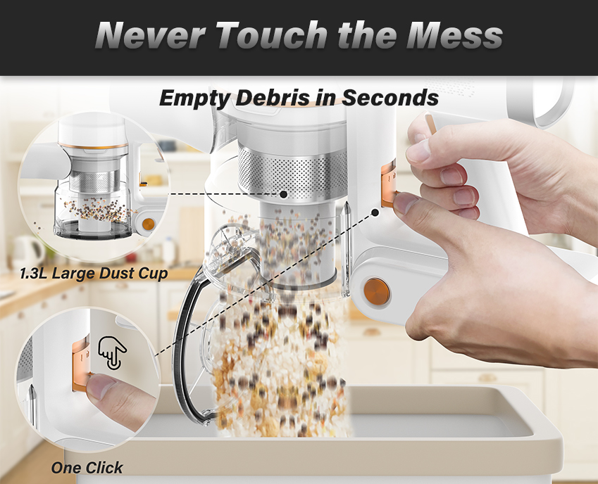 【One-Touch Emptying Design】 The lightweight vacuum cleaner's one-touch emptying design allows you to quickly empty dirt and debris to avoid touching the mess, which is friendly to dust allergy people. The removable 1.3L Dust Cup meets multiple cleaning without frequent emptying.