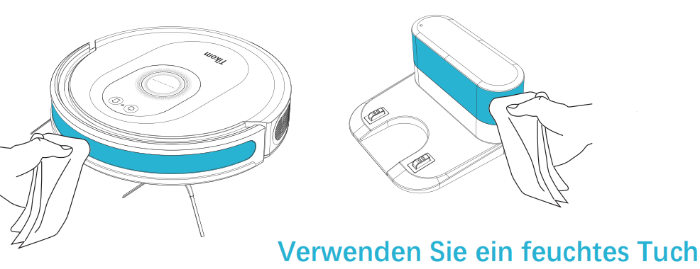 4. Reinigen Sie die Ladekontakte sowohl an der Ladestation als auch am Roboter mit einem trockenen Tuch und wischen Sie die Sensoren beider Geräte mit einem leicht feuchten Tuch ab.