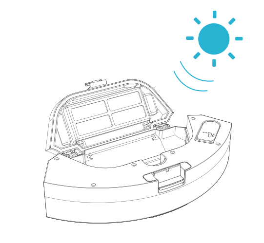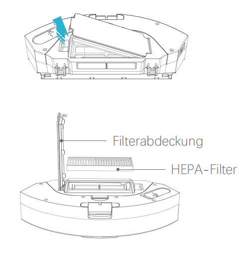 8. Setzen Sie den HEPA-Filter wieder in das Filterfach ein und platzieren Sie den Staubbehälter zur眉ck im Roboter.