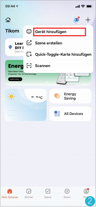 2. Öffnen Sie die TuyaSmart-App, tippen Sie auf „+鈥 und dann auf „Gerät hinzuf眉gen鈥 in der oberen rechten Ecke.