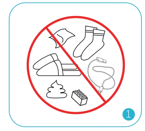 1. Entfernen Sie alle Objekte vom Boden, die den Roboterstaubsauger verheddern könnten, wie z. B. Haustierabfälle, Socken, Kleidung, Taschent眉cher, Spielzeug, rutschige Oberflächen und Stromkabel.