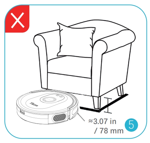 5. Vermeiden Sie L眉cken, die nahe bei 78 mm (3,07 Zoll) liegen (die Dicke des Roboterkörpers), um zu verhindern, dass der Roboter stecken bleibt. Verwenden Sie den Begrenzungsstreifen, um enge Räume nach Bedarf abzusperren.