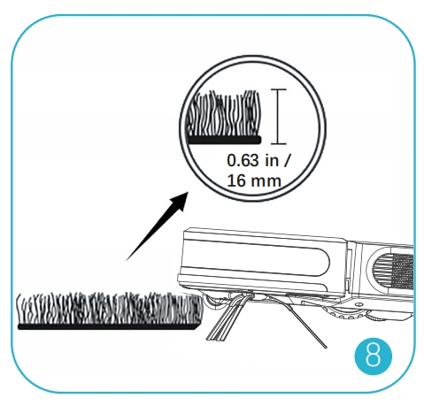 8. Vermeiden Sie die Reinigung von Teppichen mit hohem Flor, die dicker als 16 mm (0,63 Zoll) sind, da sie den Roboter zum Fehlfunktionen bringen könnten.