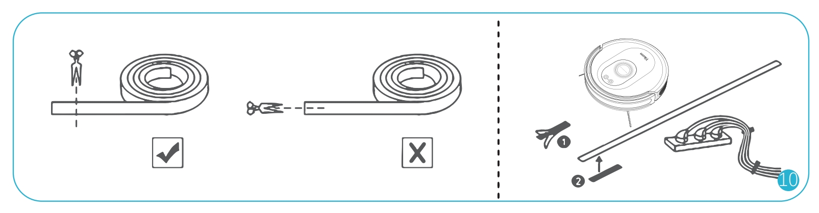 10. Um zu verhindern, dass der Roboter unerw眉nschte Bereiche reinigt, bringen Sie den mitgelieferten Begrenzungsstreifen mit dem beiliegenden Klebeband an, um eine virtuelle Barriere zu erstellen.