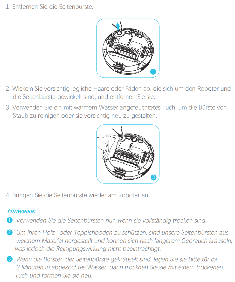 Schalten Sie den Roboter aus, 眉berpr眉fen Sie dann die Seitenb眉rste und entfernen Sie Fremdkörper.