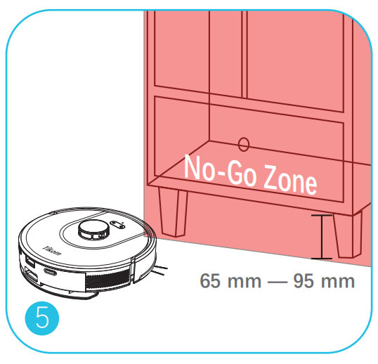 5. Der Abstand zum Boden unter Möbeln sollte weniger als 65 mm (2,56 Zoll) oder größer als 95 mm (3,74 Zoll) betragen.