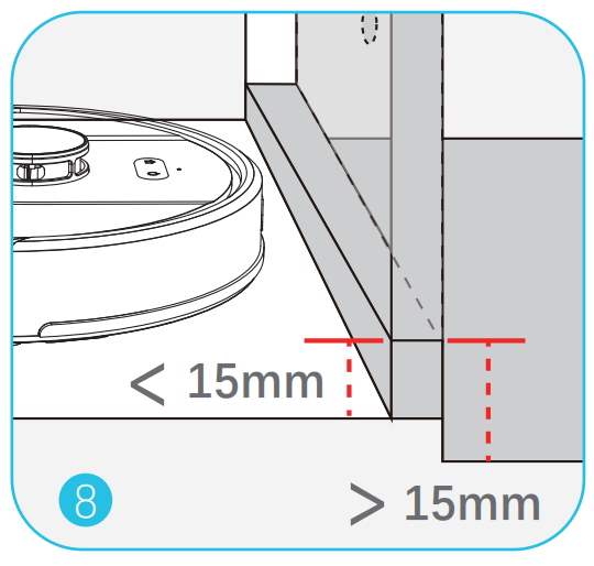 8. Da der Roboter Schwellen von bis zu 15 mm (0,6 Zoll) 眉berqueren kann, kann es passieren, dass er einen Raum betritt, aber nicht wieder verlässt,