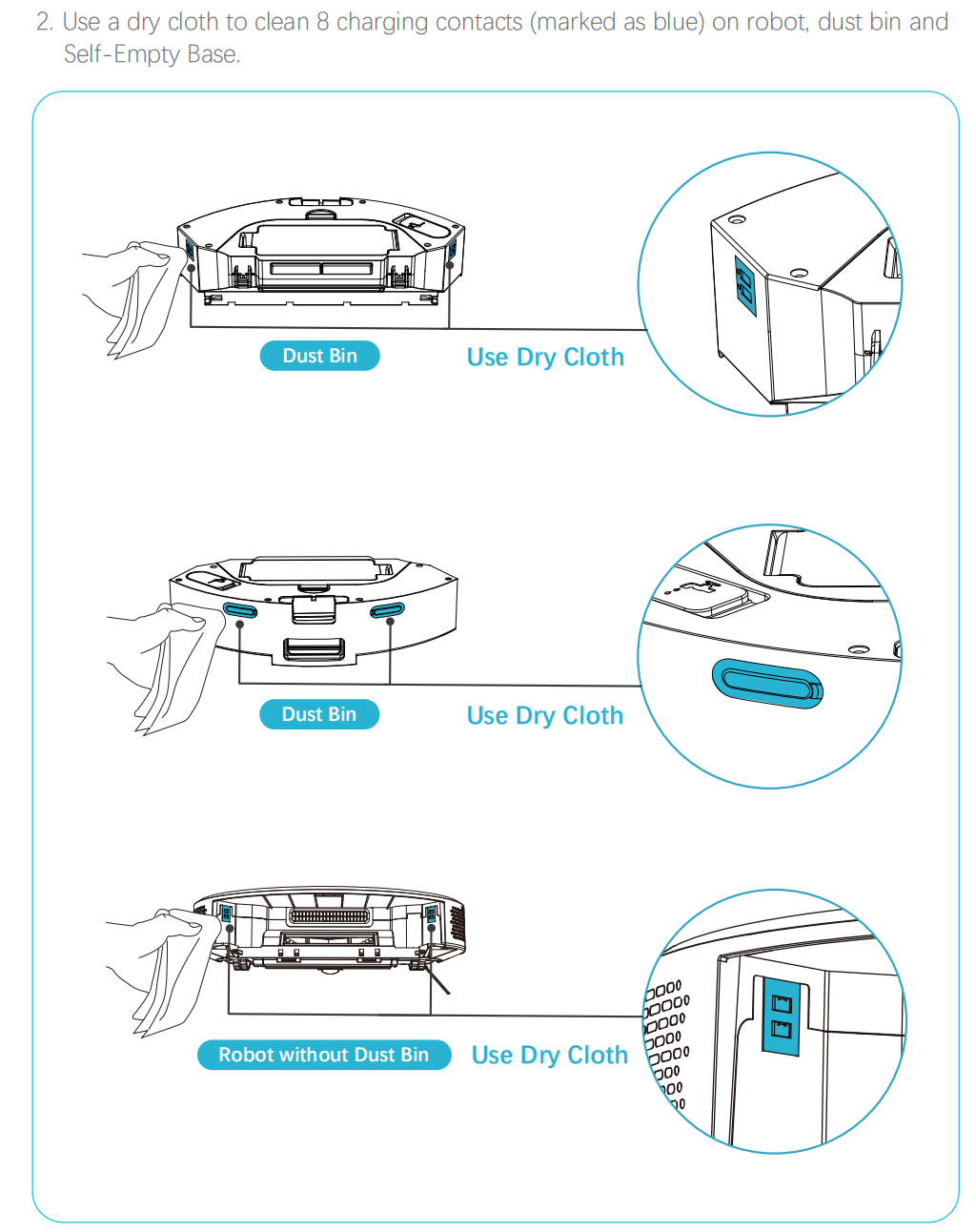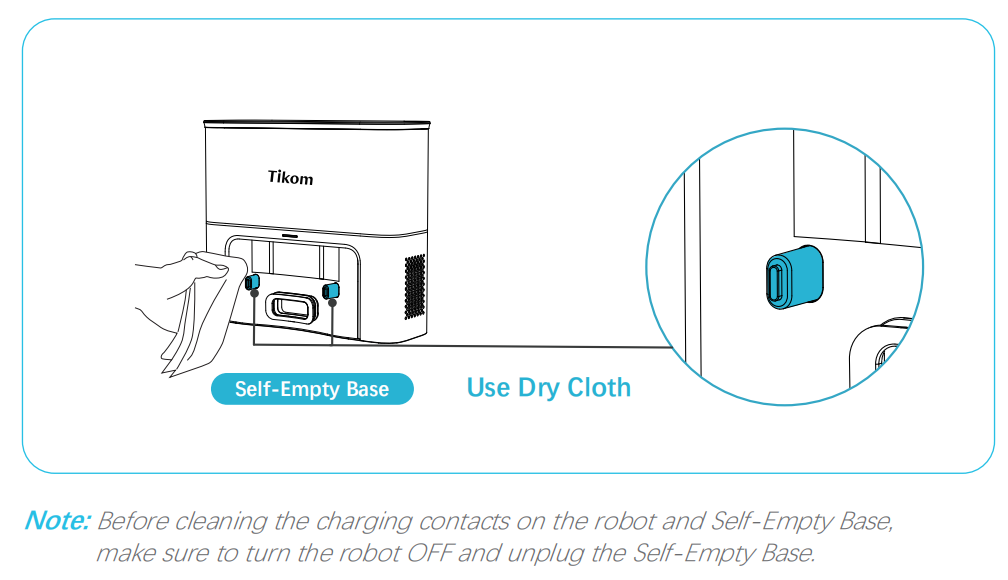 3. Clean the charging contact pins on the Self-Empty Base and the robot with a dry cloth.