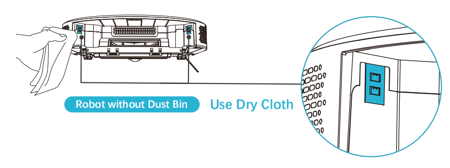 2. Use a dry cloth to clean 8 charging contacts (marked as blue) on robot, dust bin and Self-Empty Base.