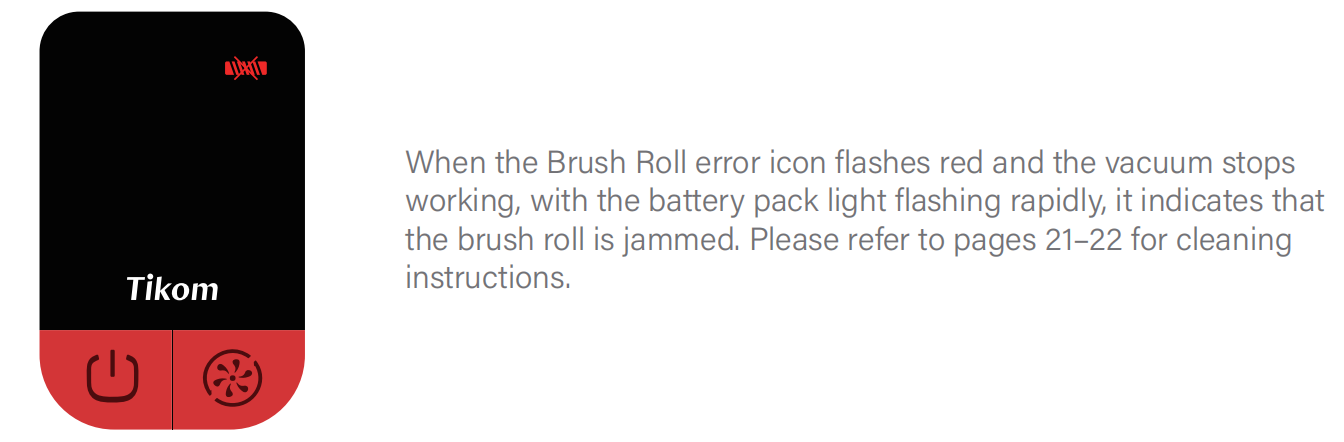 The Brush Roll Jamming lcon is flashing red, and the light band on the screen is also flashing red, indicating that the Brush Roll is stuck.
