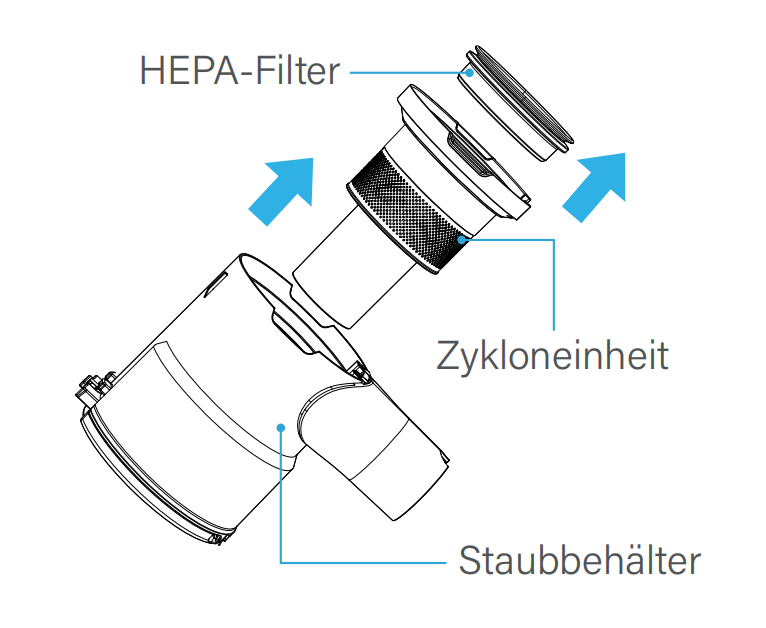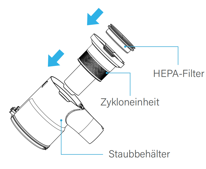11. Bauen Sie die Zykloneinheit und den HEPA-Filter in den Staubbehälter ein.