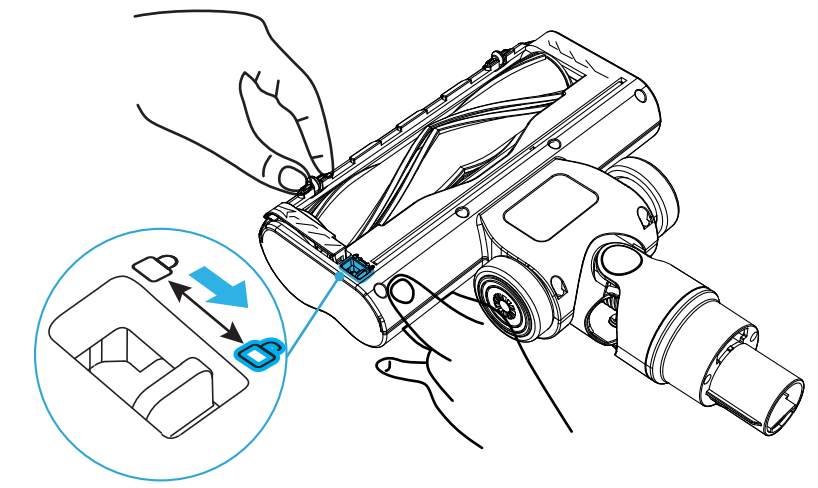 2. Dr眉cken Sie den Entriegelungsschalter an der Unterseite des Reinigungskopfes und anschließend die Verriegelung der B眉rstenrolle, damit diese nach oben springt.