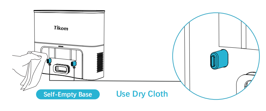 2. Use a dry cloth to clean 8 charging contacts (marked as blue) on robot, dust bin and Self-Empty Base.