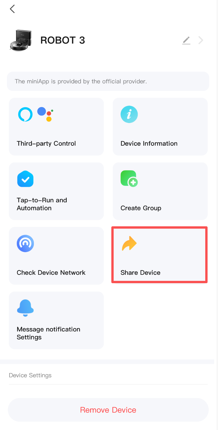Share the robot vacuum with another Tuya account. Please refer to the steps below.